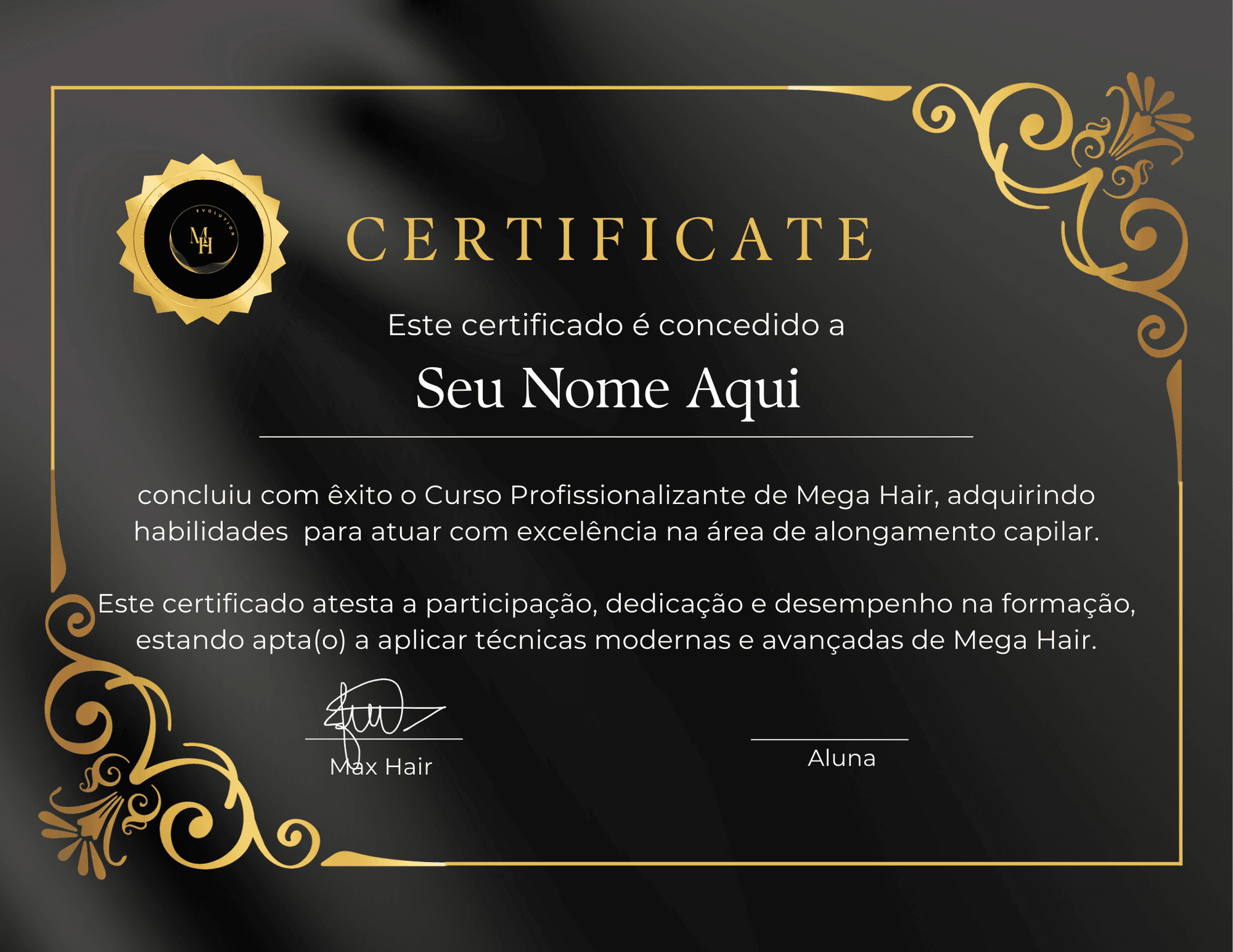 Ao finalizar o curso de Mega Hair, você irá baixar um lindo certificado de conclusão válido em todo o território nacional. Este certificado não só comprova a sua dedicação e empenho, mas também valoriza o conhecimento adquirido, proporcionando uma prova concreta de sua qualificação.